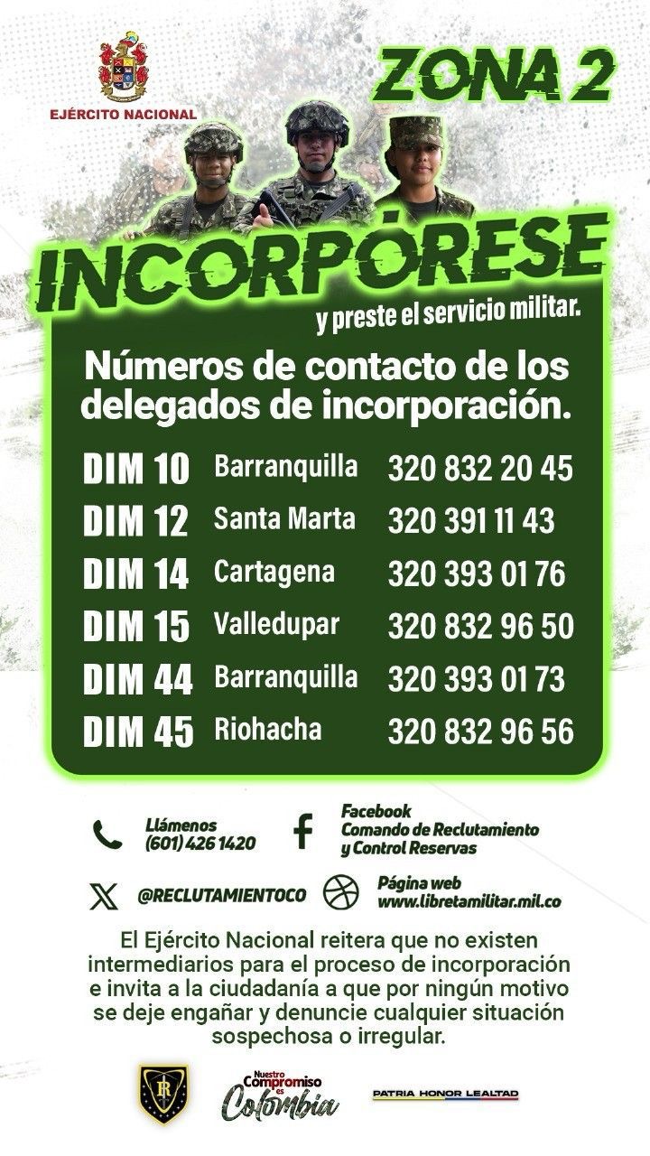 Los interesados podrán acercarse a los distritos militares ubicados en la jurisdicción de la Segunda Brigada o a cualquiera de las unidades militares de la región en los departamentos del Atlántico y Magdalena.