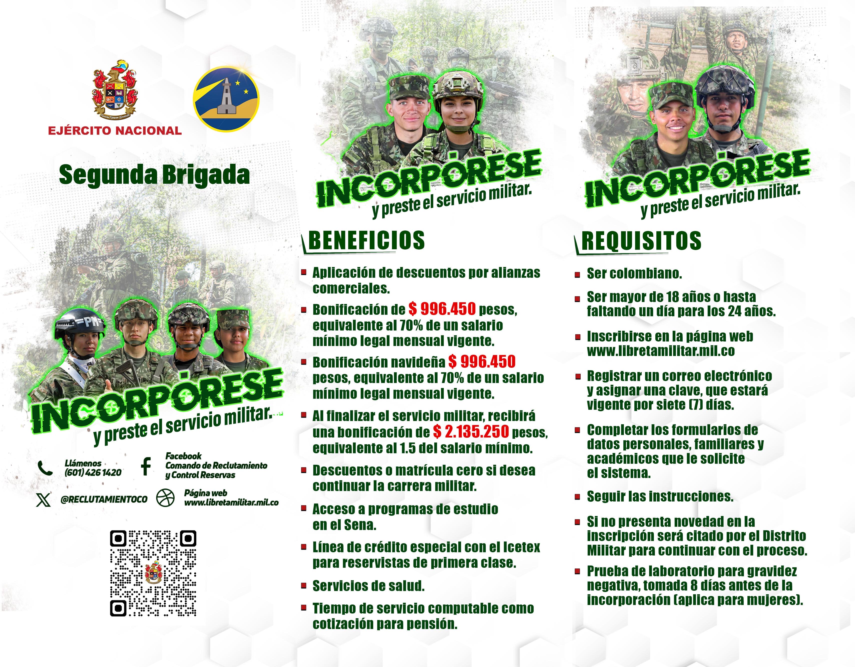 El Ejército Nacional, a través de la Segunda Brigada, invita a los jóvenes entre los 18 años y faltando un día para cumplir los 24 a participar en la jornada de incorporación del cuarto contingente del año 2025, que se desarrollara del 1 al 17 de noviembre.