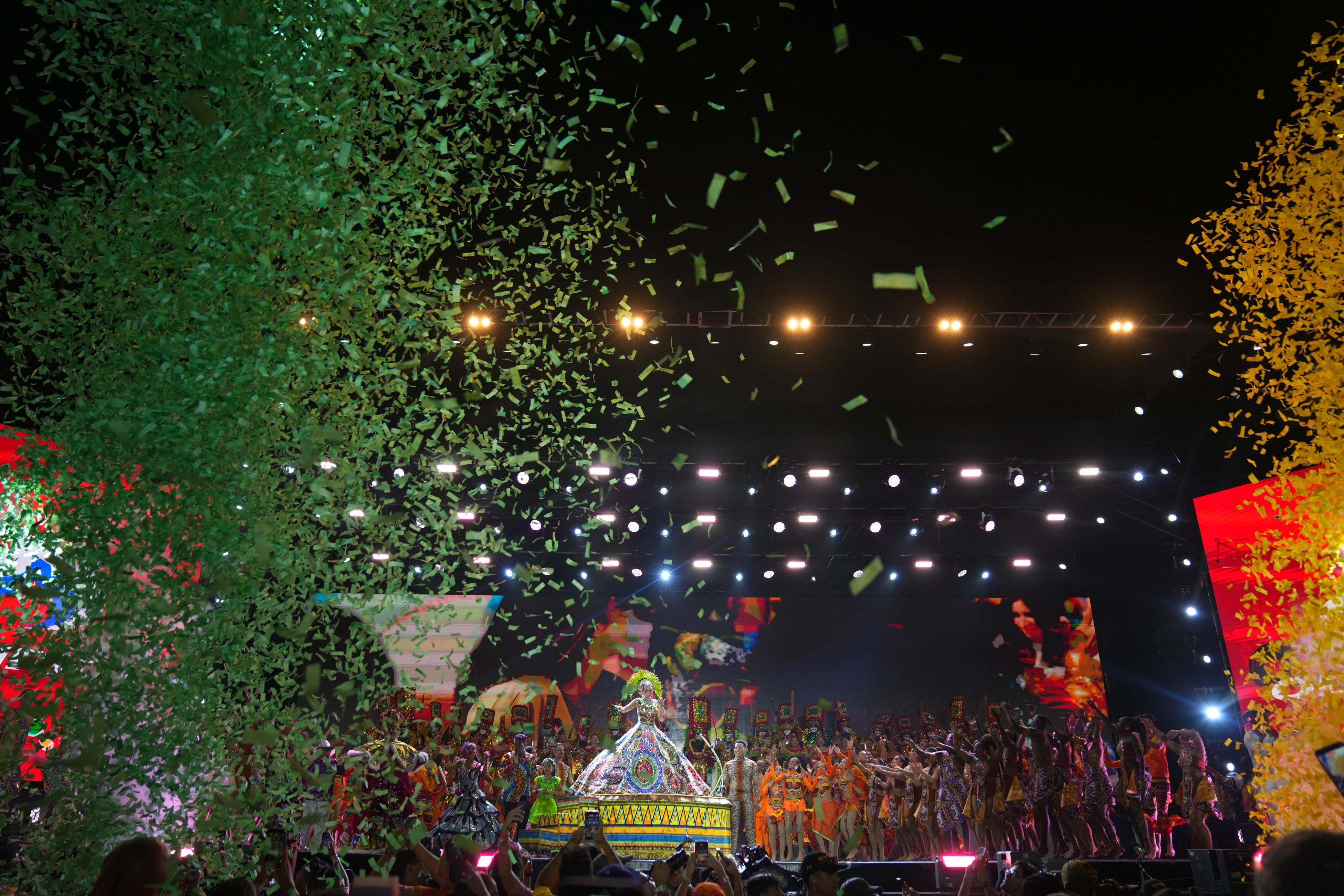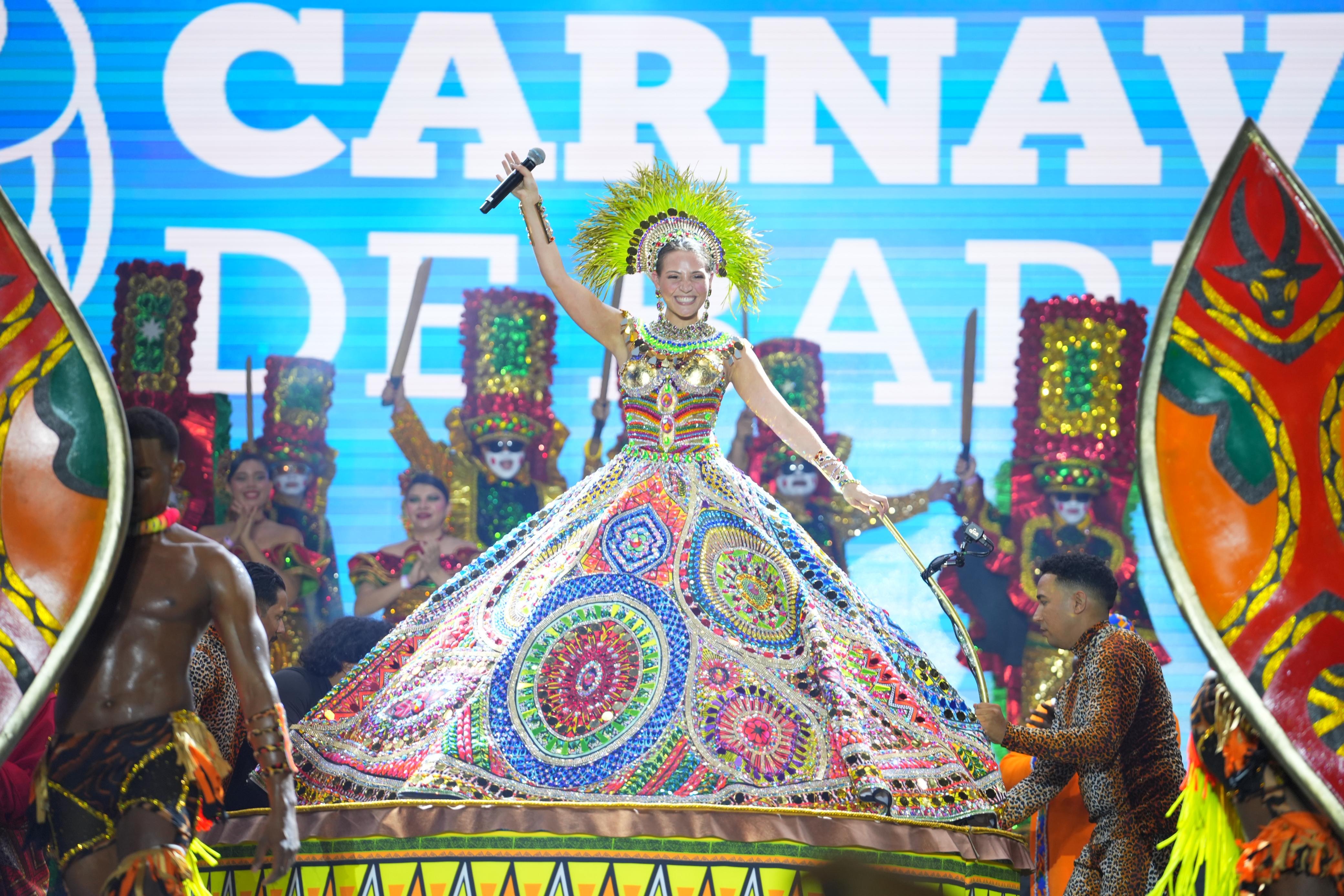 Con una puesta en escena con más de 700 bailarines, la soberana Michelle Char Fernández rindió homenaje al legado ancestral africano y su huella en la identidad cultural del Caribe y del Carnaval.