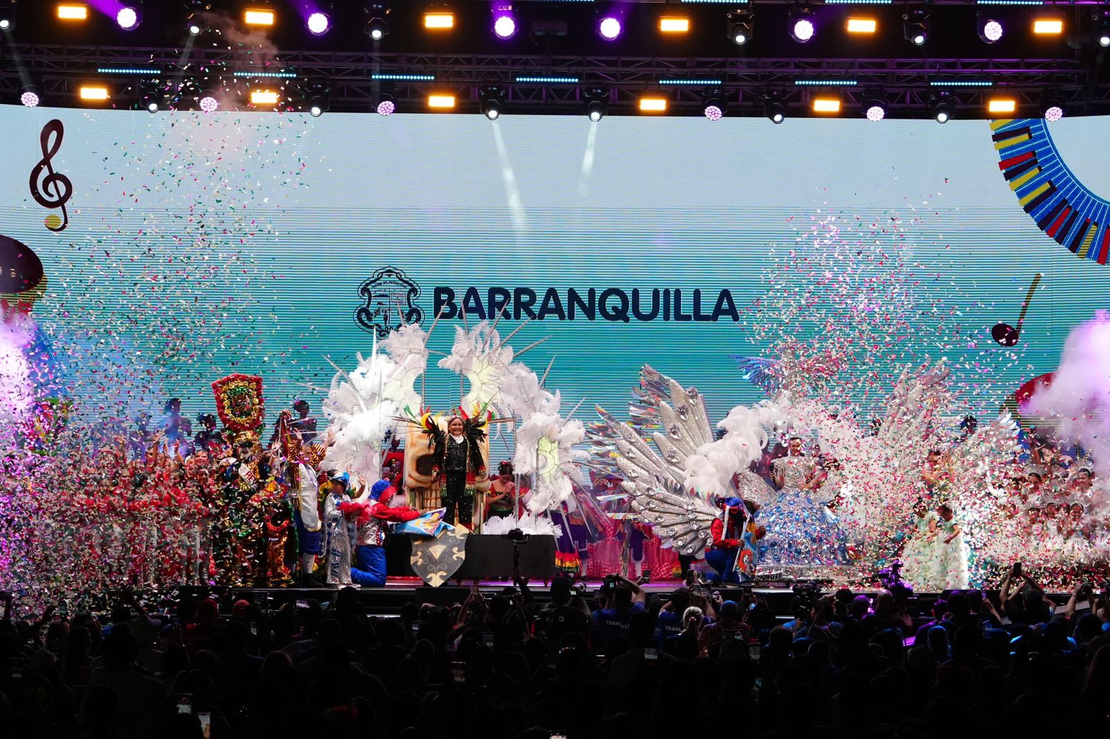 Sharon Acosta y Joshua Ortiz, presentaron una puesta en escena que convirtió la música en el hilo conductor de un espectáculo pensado para todas las generaciones, reuniendo en un mismo escenario a grandes figuras musicales del Caribe, nuevas generaciones de artistas y expresiones patrimoniales representadas por 30 semilleros del Carnaval.