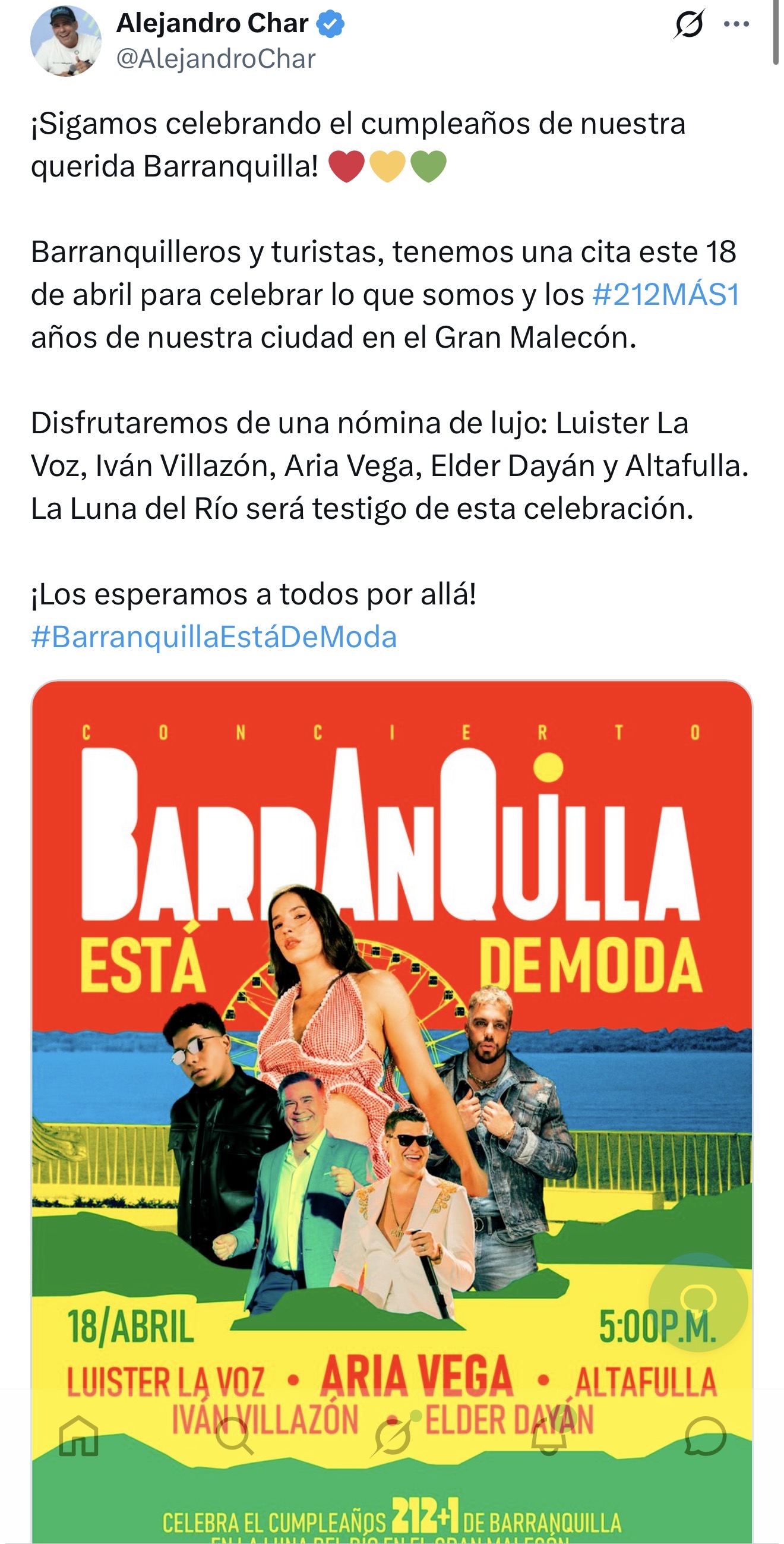 Tras cantar la canción del cumpleaños, entonada por la Banda de Baranoa, el mandatario explicó que la celebración también tendrá otro momento memorable en próximos días: “Hoy estamos festejando aquí, pero es todo el mes. Ell 18 de abril a las 5:00 de la tarde los esperamos en el otro malecón, el que está junto al río Magdalena. Allá tendremos a Luister, nos va a acompañar Altafulla, Aria Vega, Iván Villazón y Elder Dayan, la plana mayor”.